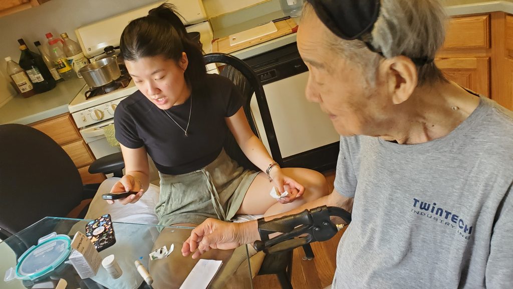 Pastor Joseph is completing day 2 of a 3 day fast. By God’s grace, his heart still stands strong and determined to see Jesus’ healing. This has affected his energy level and close monitoring of his condition has become a blessing of the generations – as his granddaughter, Chloe, who works as a surgical nurse assistant (enroute to becoming a PA), blesses him with a blood sugar level test.