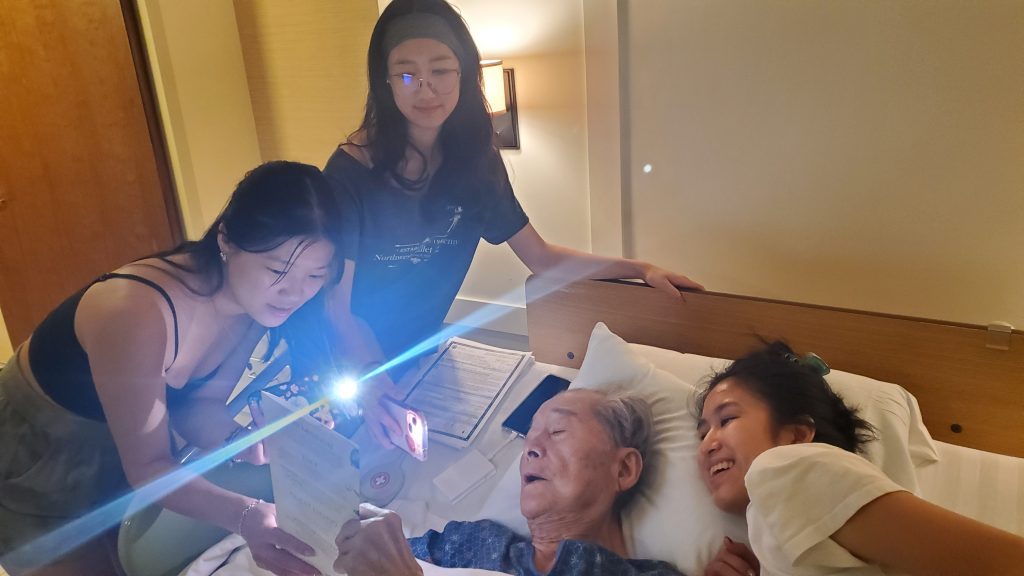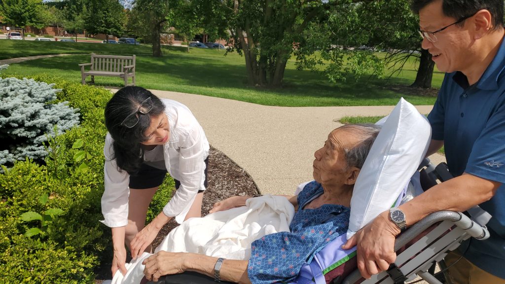 Pastor Joseph’s energy level continues to wane and the majority of his day is now spent sleeping. Nevertheless, he still insists on going outside for his daily Vitamin D in the sun – even in 95-degree weather. He wanted to step on the grass even though strapped to the wheelchair, so Tzu-Ann and Li-En did the next best thing by touching his feet to the bush.